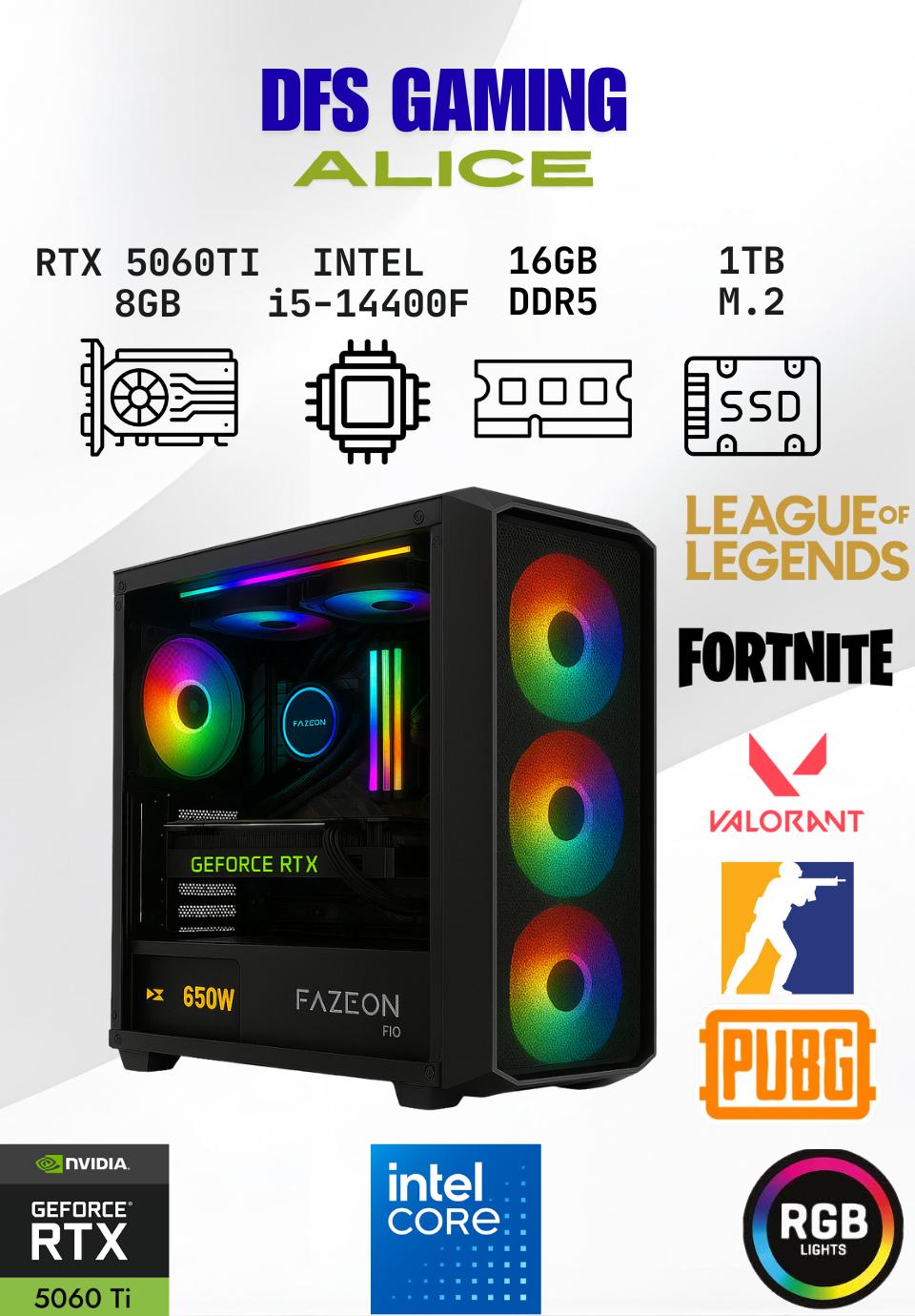 DFS Gaming ALICE INTEL i5 14400F-H610M-RTX 5060 TI 8GB-16GB DDR5 RAM-1TB M.2 SSD-OYUNCU BİLGİSAYARI