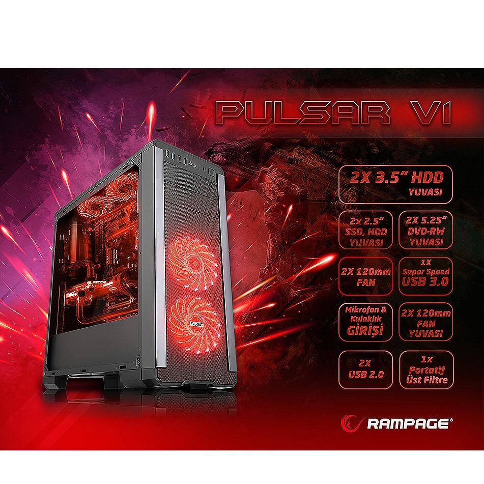 Gaming özellikleri ile donatılmış bu kasada soğutma sistemi için 2 adet 120mm fan ve 2 Adet 120mm fan yuvası bulunmaktadır. Ayrıca kasamızda bulunan 2x 5.25" DVD-RW, 2X 3.5" HDD, 2X 2.5"SSD & HDD yuvaları aynı anda birçok cihaz bağlamanıza olanak sağlar ve vidasız bir şekilde kolaylıkla montaj imkanı tanır. 2 Adet kırmızı ledli 120mm fan, kasa içeriğinde bulunmaktadır. PULSAR V1 kesinlikle sizi memnun edecek bir oyuncu kasasırdır!